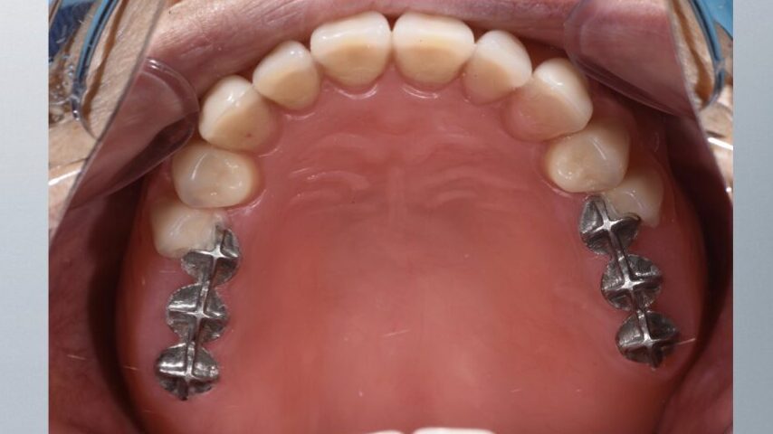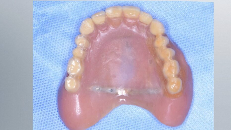 | 治療方法 | 残念ながら残っている歯は全て虫歯、歯根破折により残せない状態だったため抜歯を行いました。ブランチングテクニック(仮の義歯での試行錯誤を行なってから最終的な義歯を作るやり方)の過程で下顎の残っている骨の幅が少なすぎて義歯を大きくせざる得なかったため最小限の侵襲(フラップレスサージェリー)にて義歯をサポートするためのインプラントを入れました。 |