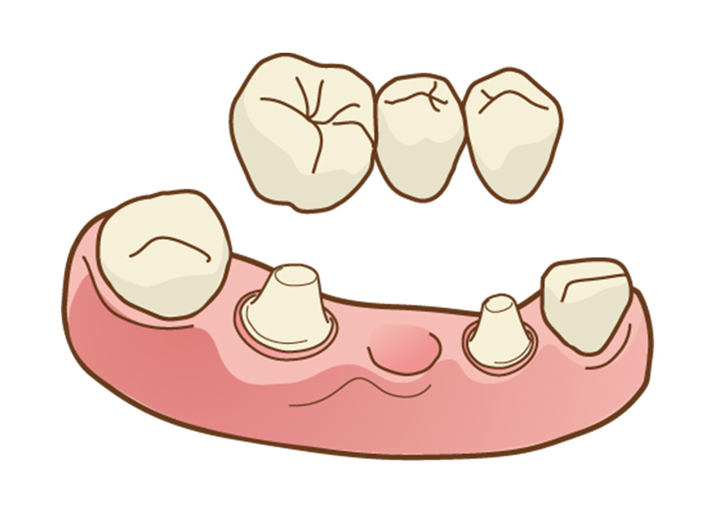 - ブリッジの構造上、たとえ両隣の歯が健康な歯でも、削って被せ物を橋渡しするような形で装着するので、両隣の歯を傷めやすい