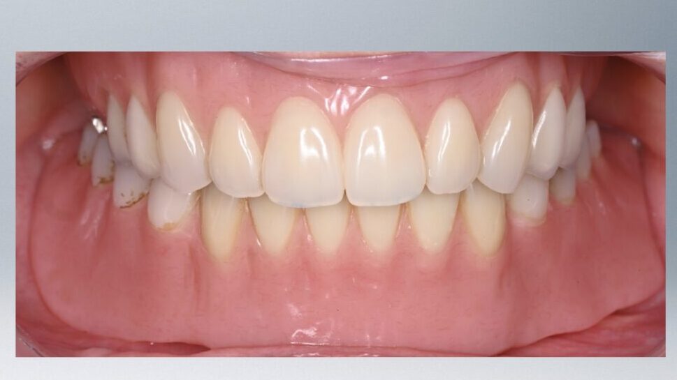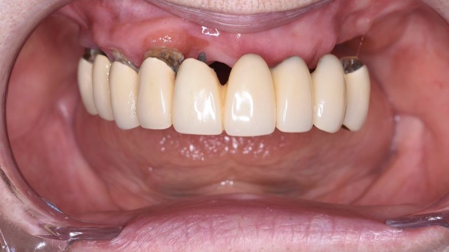 | 治療方法 | 残念ながら残っている歯は全て虫歯、歯根破折により残せない状態だったため抜歯を行いました。ブランチングテクニック(仮の義歯での試行錯誤を行なってから最終的な義歯を作るやり方)の過程で下顎の残っている骨の幅が少なすぎて義歯を大きくせざる得なかったため最小限の侵襲(フラップレスサージェリー)にて義歯をサポートするためのインプラントを入れました。 |