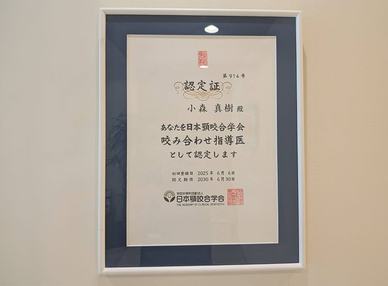院長は、咬み合わせ治療の専門家として、日本顎咬合学会が認める「咬み合わせ指導医」の資格を持っています。これは、同学会の認定医の中でも、特に豊富な経験と高度な技術を持つ、指導的な立場の歯科医師に与えられる資格です。咬み合わせ指導医だからこそ、ご提供できることがあります。
